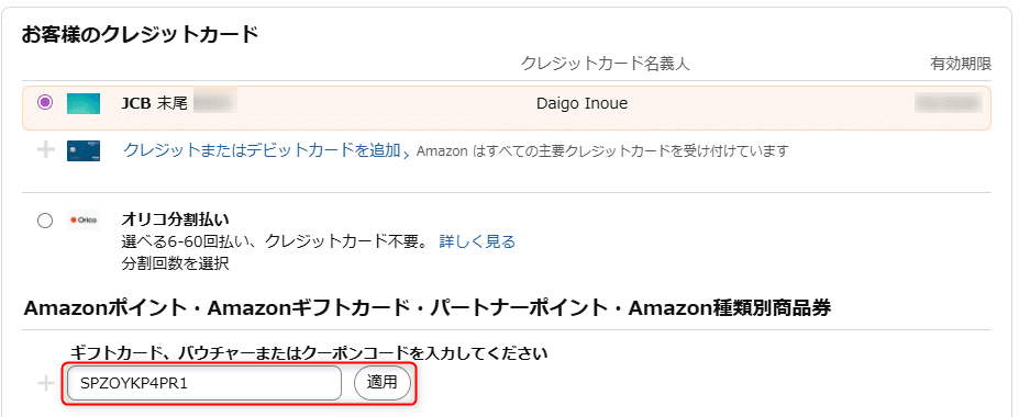 この枠の中にクーポンコードを入力して「適用」ボタンを押してくださいね。