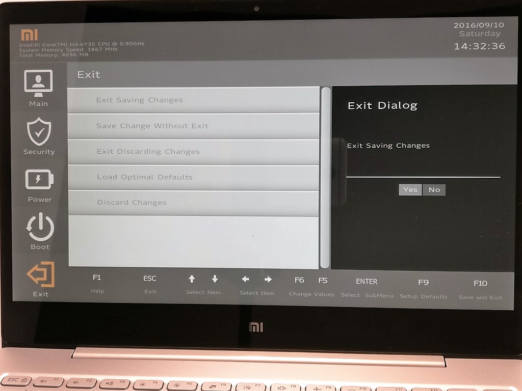 MiのBIOSはマウスを使えないようなので、矢印キーやESC・ENTERなどを使って操作します。